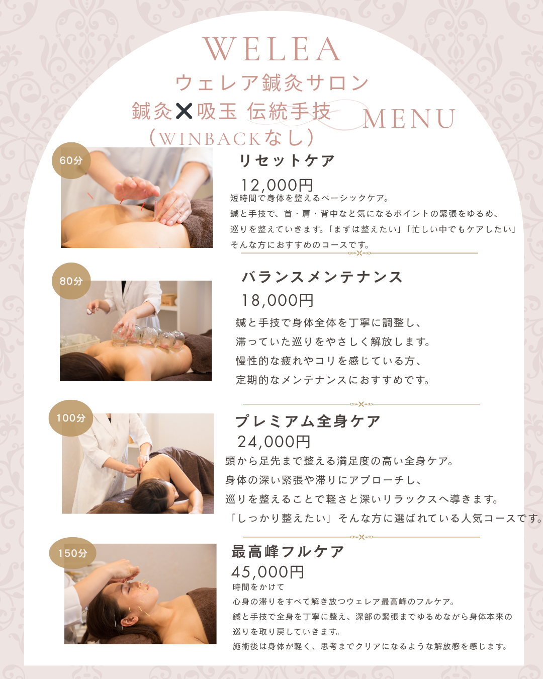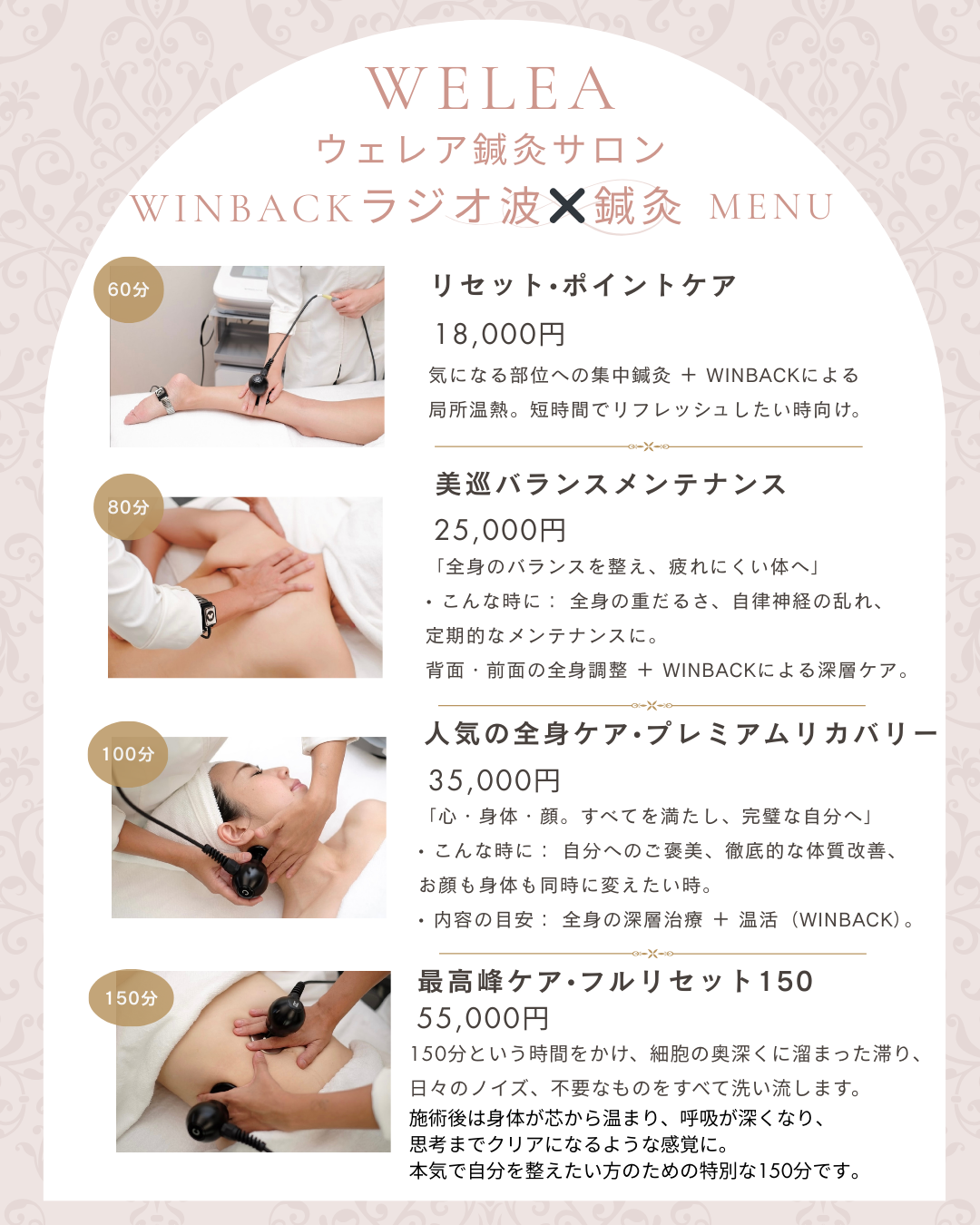 ・内容:背面・前面の全身調整にウィンバック(ラジオ波)の深層ケアをプラス。自律神経を整え、滞っていた巡りをスムーズにします。
